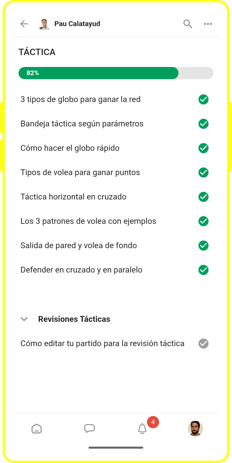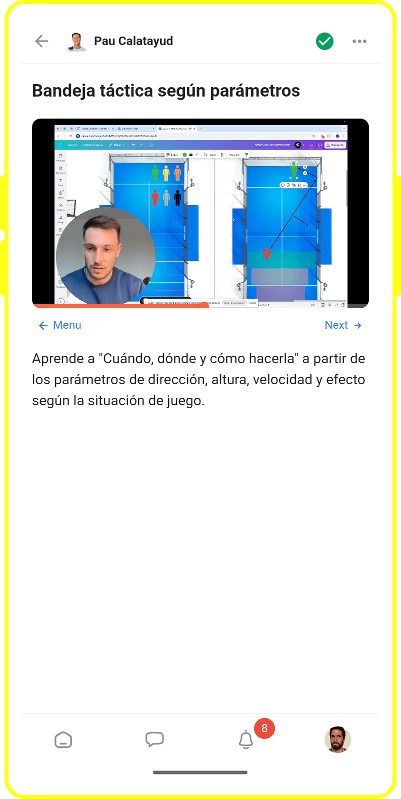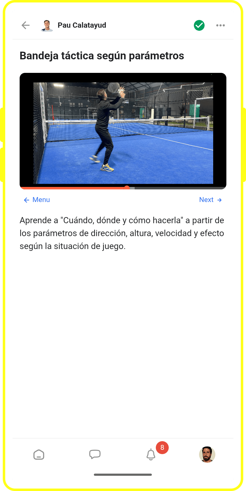 Abordamos problemas concretos detectados en tus partidos, permitiéndote integrar los consejos extraídos de tus revisiones técnico-tácticas y otras estrategias, con el acompañamiento constante de tu coach y píldoras didácticas disponibles en nuestra plataforma de aprendizaje.